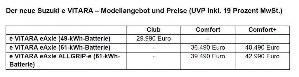 Suzuki e VITARA eAxle Comfort+ (61kWh-Batterie): Energieverbrauch kombiniert: 15,1 kWh/100km; CO₂-Emissionen kombiniert: 0g/km; CO₂-Klasse: A